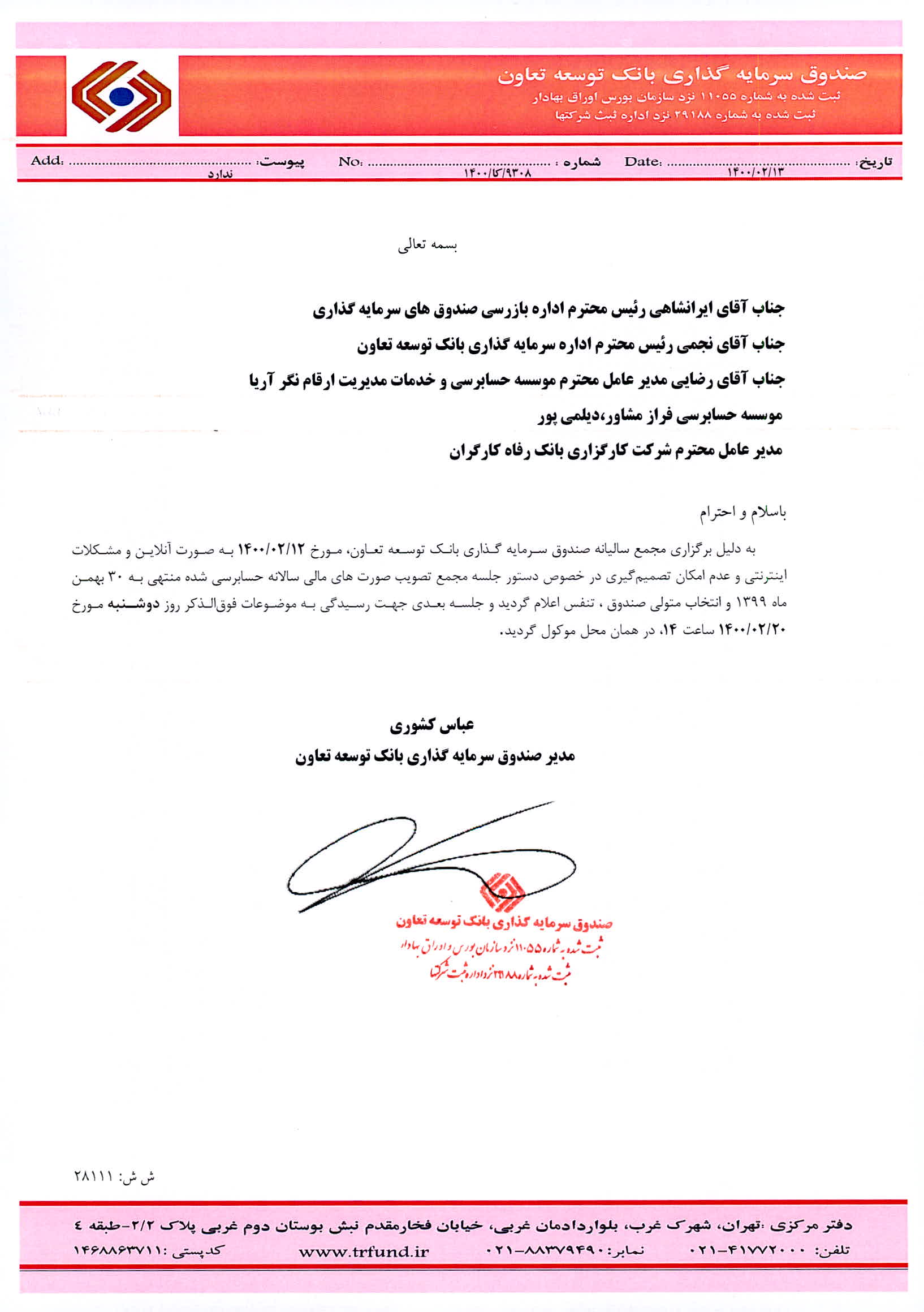 | عنوان خبر | اعلام تنفس مجمع سالیانه صندوق سرمایه گذاری بانک توسعه تعاون مورخ 1400/02/20 |