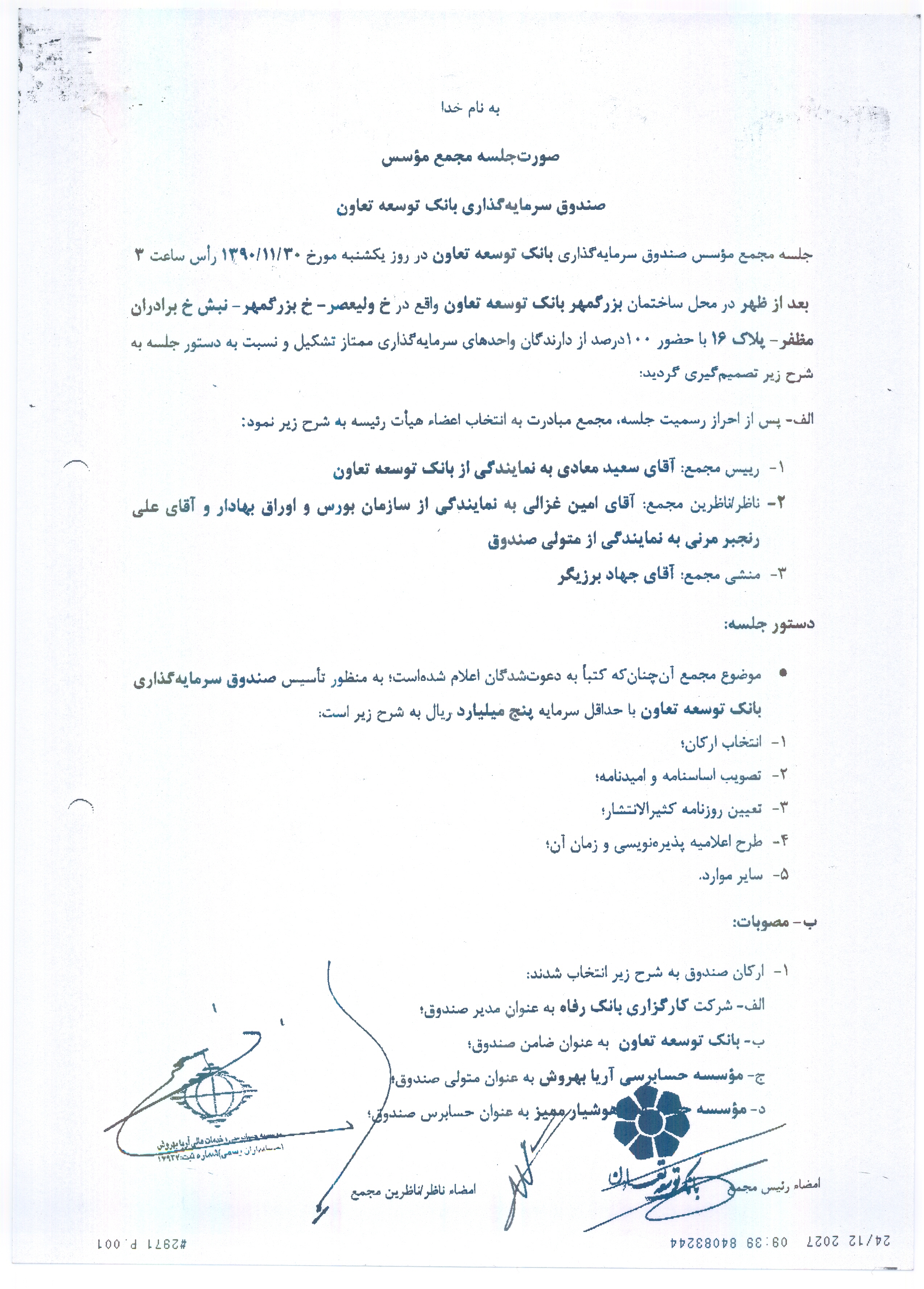 برگزاری مجمع مورخ ۲۷/۱۱/۱۳۹۲ صندوق سرمایه گذاری بانک توسعه تعاون