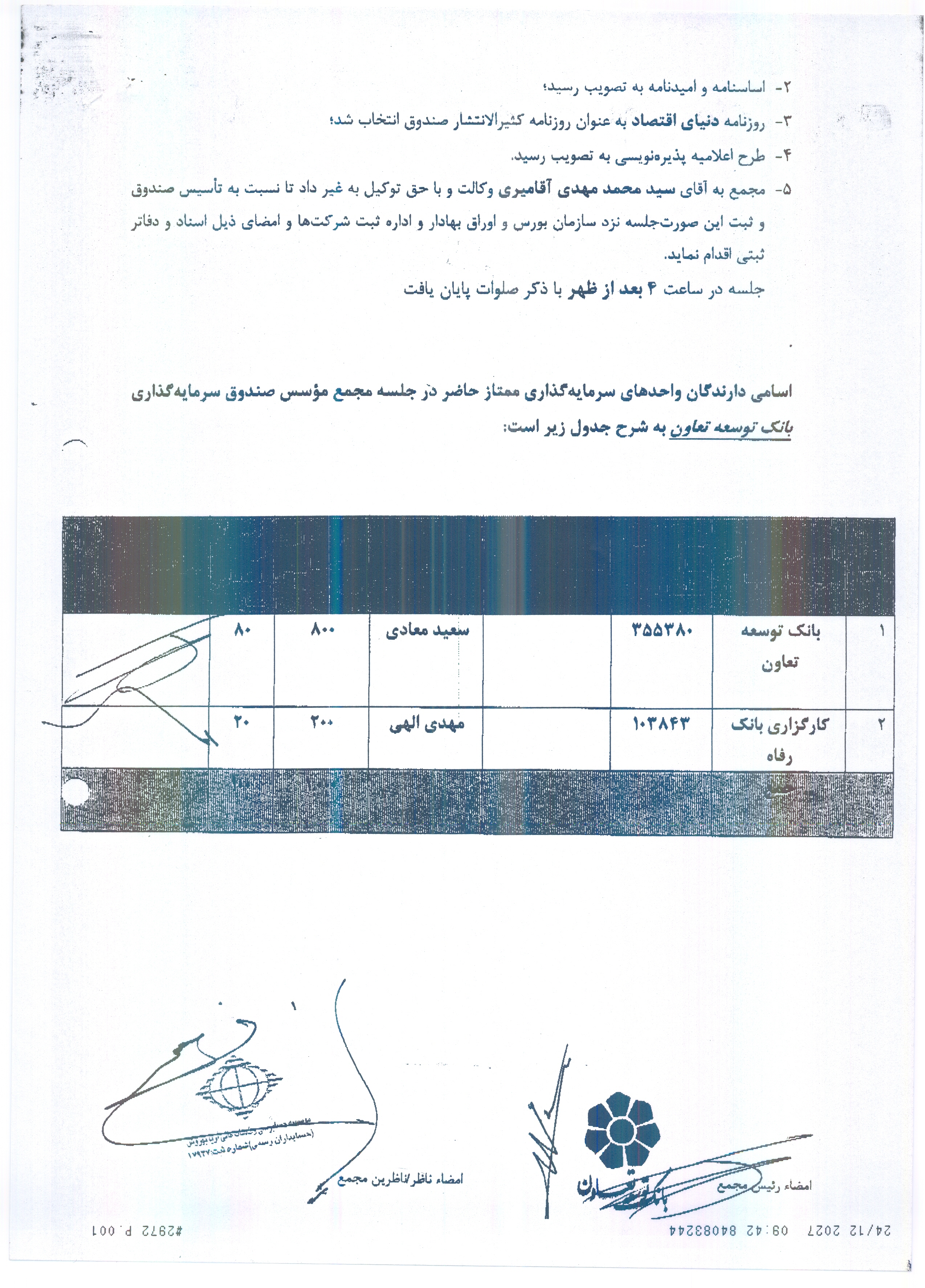 صورتجلسه و نامه مجمع تغییر صاحبان امضاء صندوق سرمایه گذاری بانک توسعه تعاون