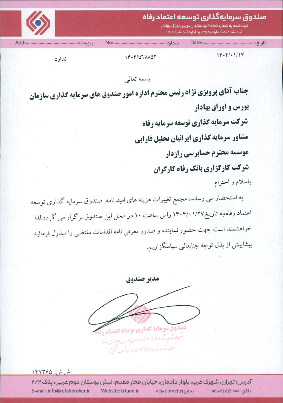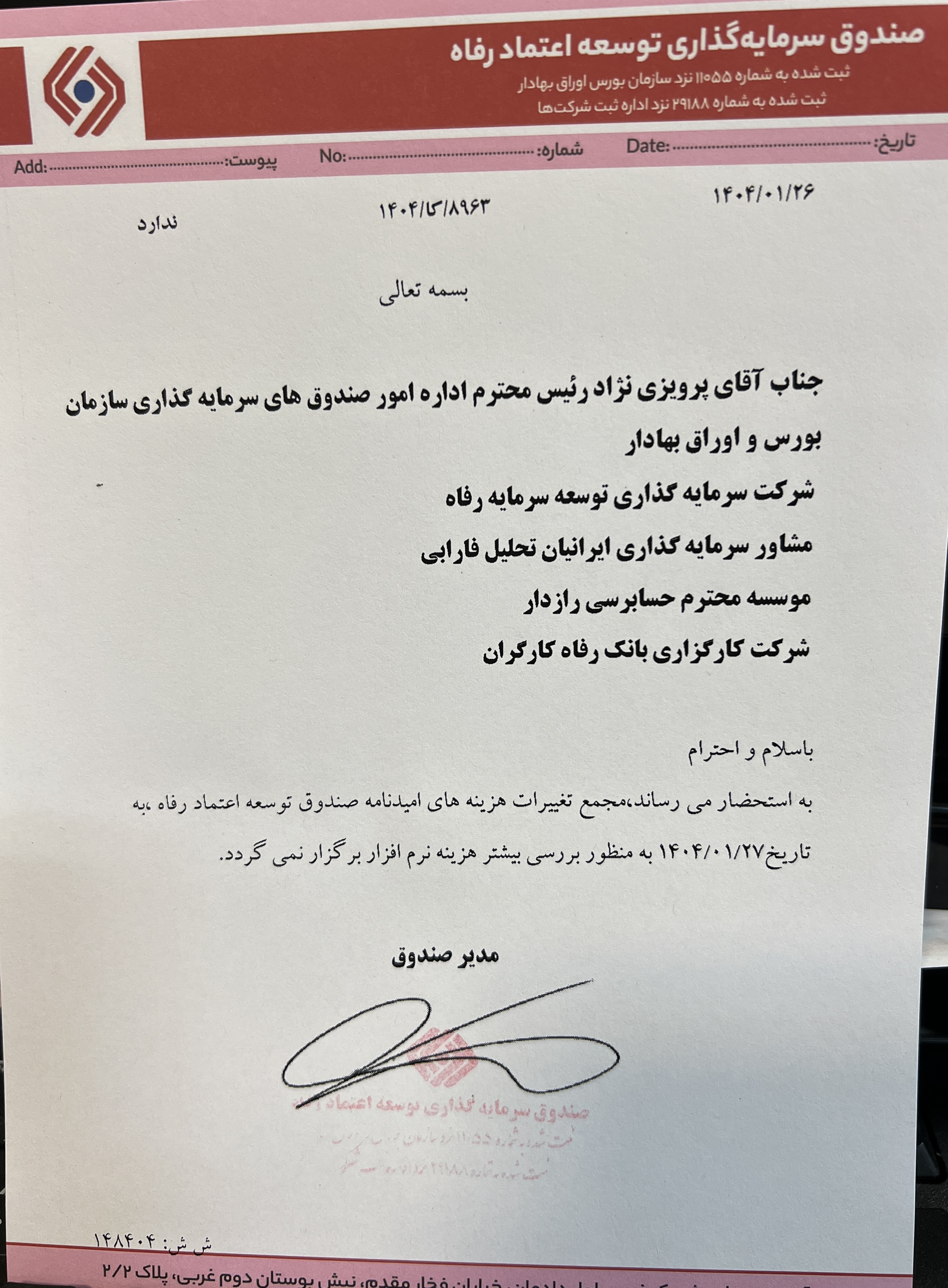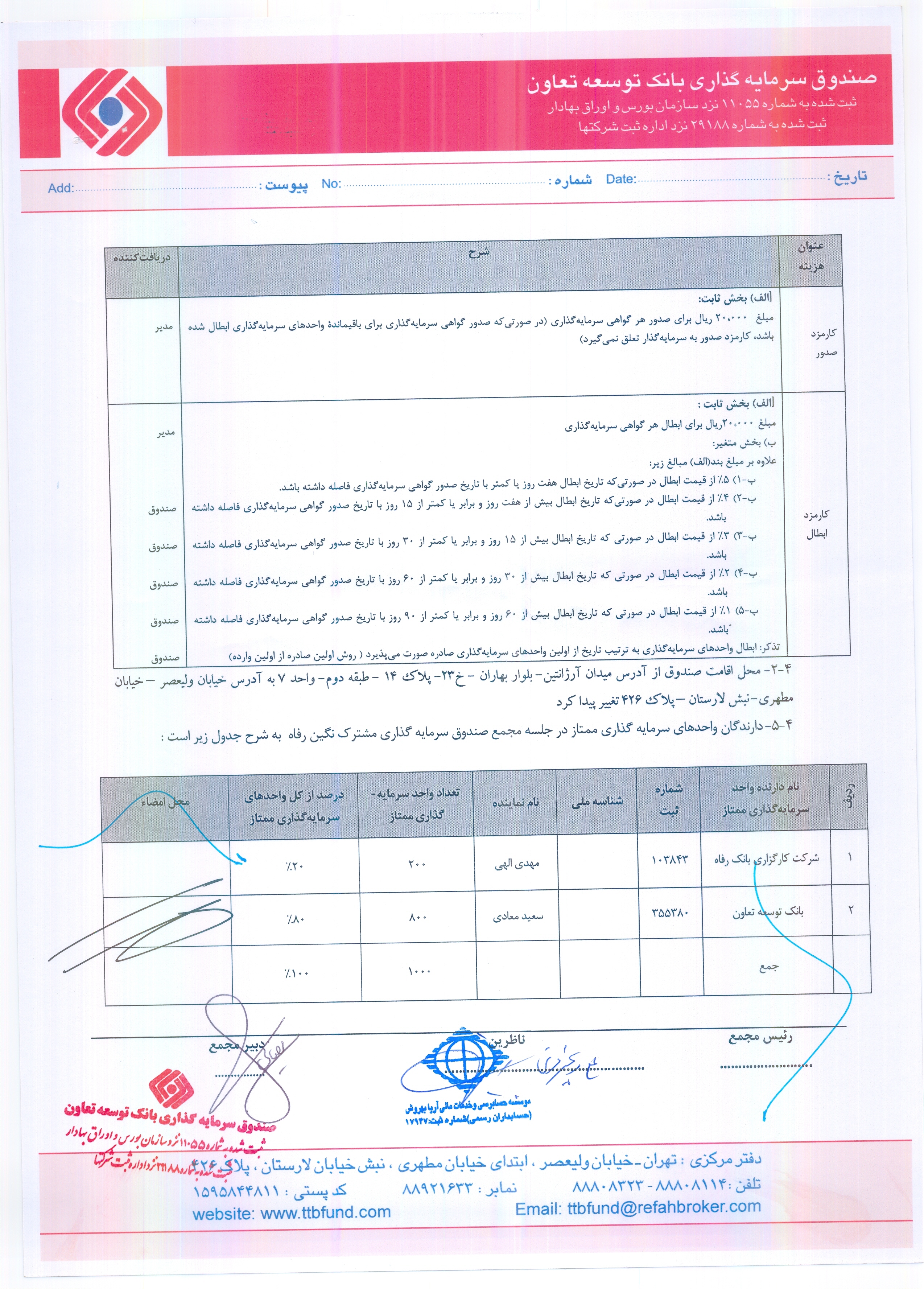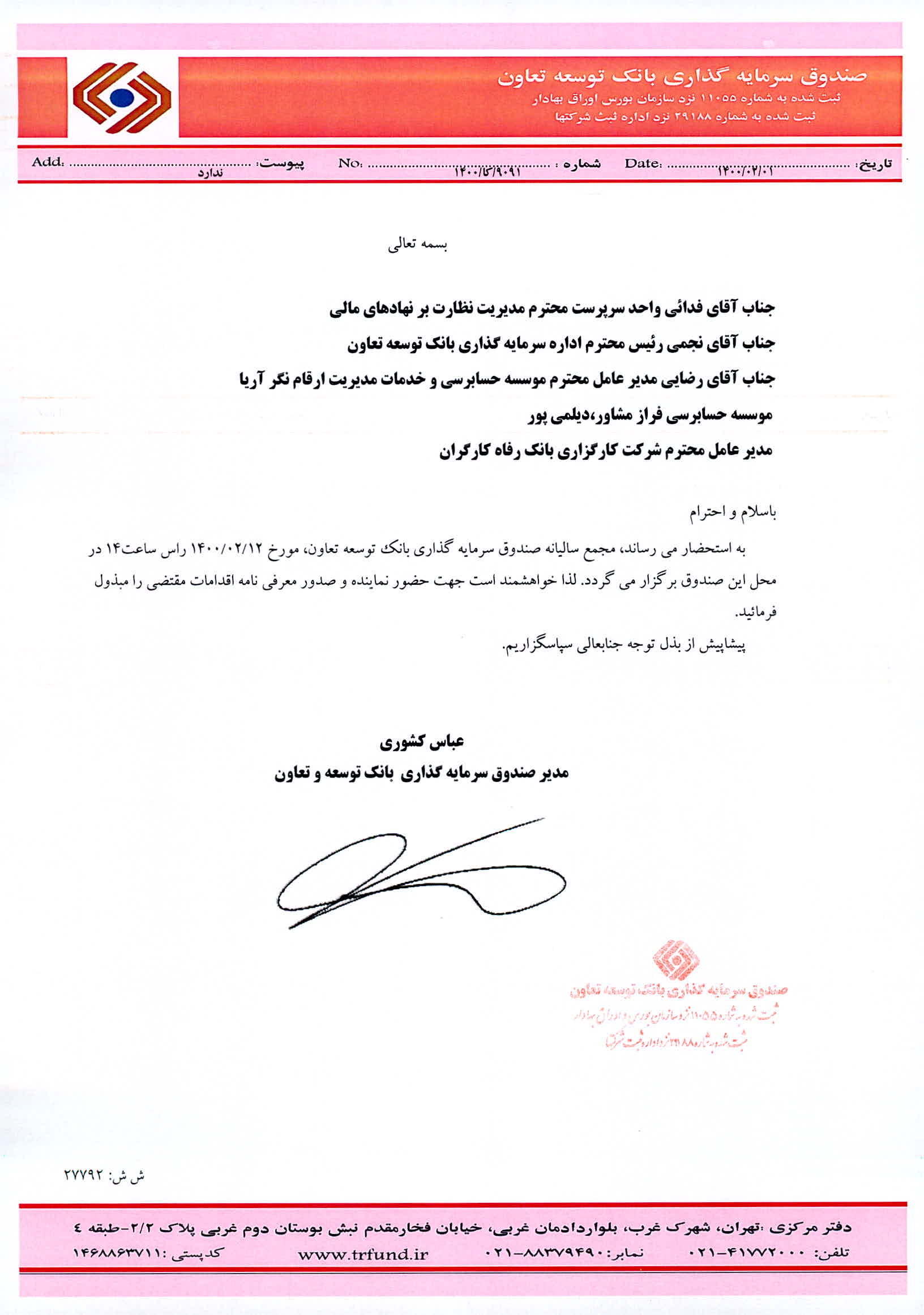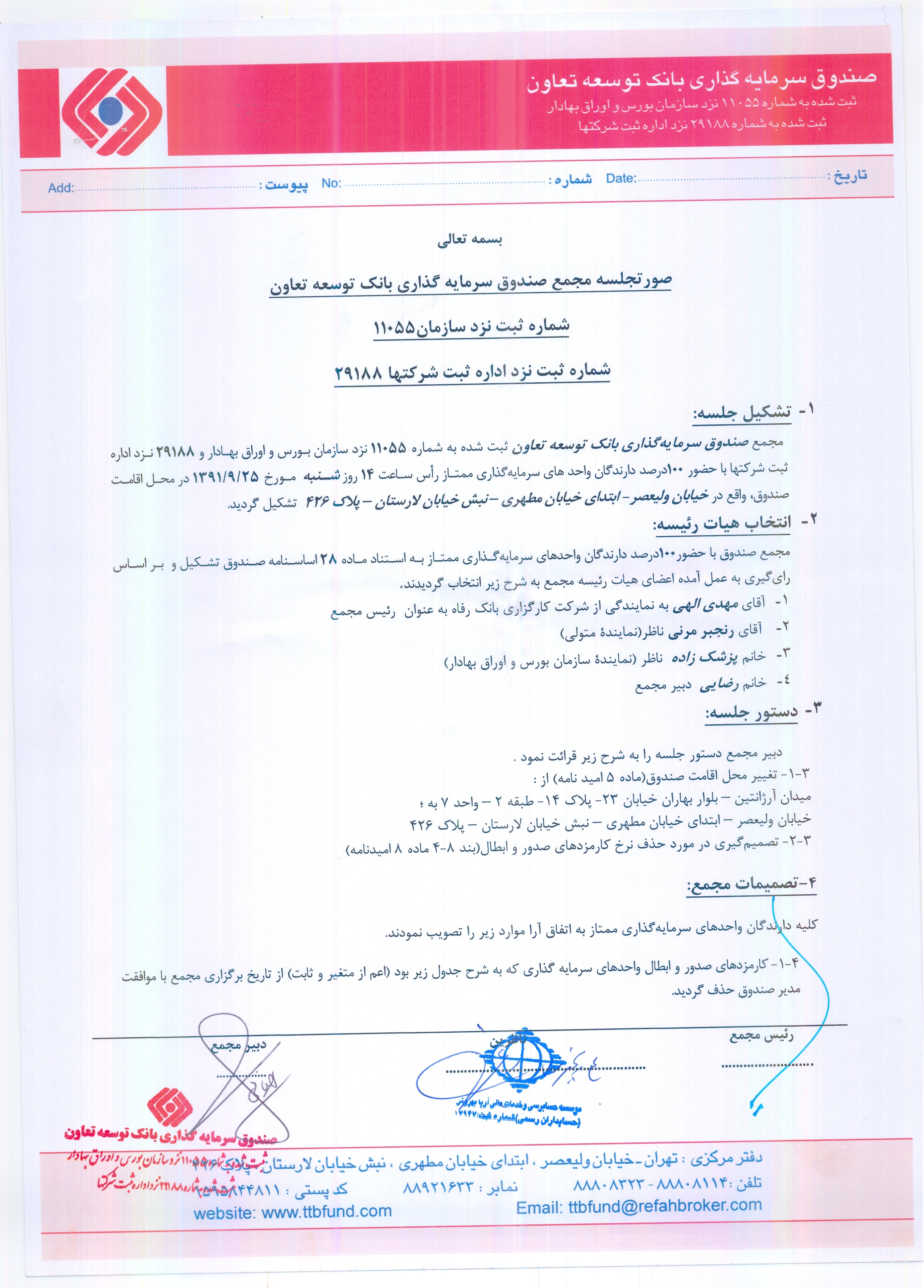 صورتجلسه و نامه مجمع تغییر آدرس صندوق سرمایه گذاری بانک توسعه تعاون